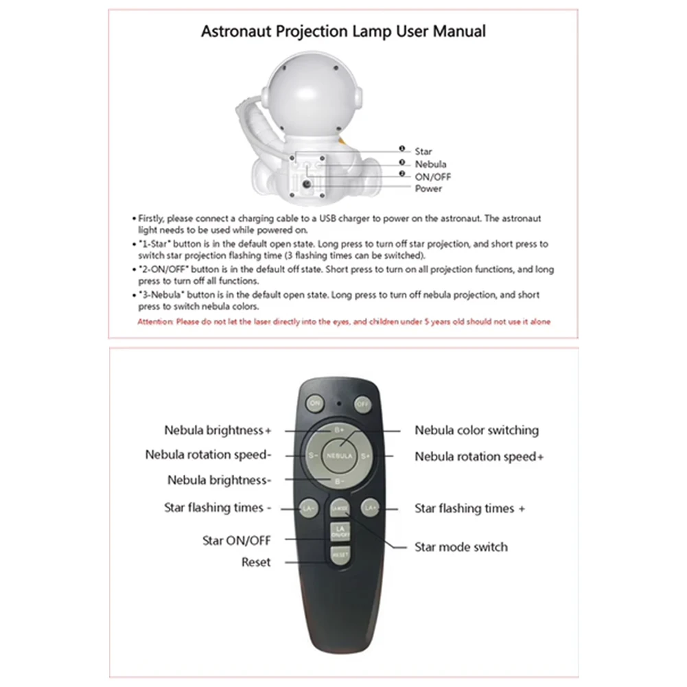 Galaxy Star Projetor 8 Efeitos Astronauta Starry Sky Projetor Galaxy Night Light Quarto Teto Lâmpada de projeção Crianças Presentes Característica: 1. Astronauta Galaxy Star Projetor:Nosso projetor estrela galáxia apresenta 8 efeitos de nebulosa românticos, sonhadores e personalizáveis, acompanhados por estrelas verdes cintilantes que podem ser projetadas nas paredes ou no teto de qualquer sala. Crie uma atmosfera serena e relaxante que parece uma vasta galáxia, tornando-se uma luz ambiente ideal para quartos infantis, home theaters, salas de jogos ou noites românticas. 2. Controlo a distância:Ajuste os padrões, brilho e velocidade de rotação com o controle remoto incluído. Personalize os efeitos da projeção conforme suas preferências. As formas das estrelas e os padrões das nebulosas podem ser controlados separadamente usando o controle remoto ou os botões da própria luz noturna led. 3. Projeção original e flexível:Esta lâmpada projetor céu estrelado astronauta tem um design único semelhante a um astronauta, com uma cabeça destacável que pode girar 360 graus para ajustar o ângulo de projeção da nebulosa. Serve como uma lâmpada de projeção funcional e uma peça decorativa fofa, adicionando um toque de novidade a qualquer espaço. 4. Apropriado para várias ocasiões:O projetor estrelado conduzido do céu pode ser usado em uma vasta gama de ajustes tais como quartos, salas de jogo, teatros home, decoração da mesa do escritório, decorações estéticas da sala, e salas de visitas. Ele cria um ambiente legal para encontros, configurações de jogos, noites de cinema, festas ou até serve como uma luz noturna estrelada para acompanhar as crianças enquanto elas dormem. 5. Um grande presente:Se você está procurando um presente de Natal para a família ou amigos, este projetor céu estrelado astronauta é perfeito para o Natal, Dia dos Namorados, aniversários e feriados das crianças. Se você é um entusiasta de estrelas, um amante da astronomia ou procura um presente para alguém especial, esta luz astronauta galáxia é uma excelente escolha. Quem não gostaria de relaxar e dormir sob um dossel de estrelas?